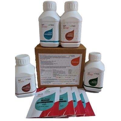 Pulse kit is a collection of products that add value to pulse crops during growth and fruiting stage. Kit contains products that help in vigorous germination & growth (Grow one), control larva that bore holes into pods (Larvecon), control soil borne fungal infections (Dcon) and helps in stress management (Maxgrow and Biosil) as well as waste decomposer culture for soil health.